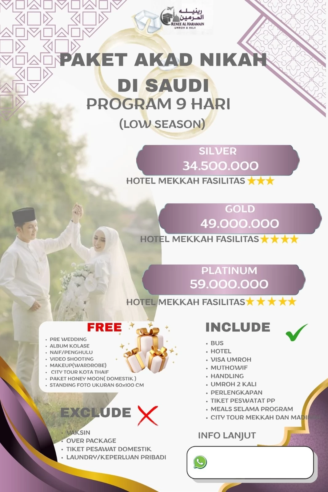 Di paket ini, Anda mendapat banyak fasilitas gratis, seperti pre-wedding photoshoot, album kolase, naif atau penghulu resmi, video shooting, makeup dan wardrobe, city tour kota Thaif, honeymoon domestik, dan standing foto ukuran besar 60x100 cm. Plus, sudah termasuk bus, visa umroh, muthowif, tiket pesawat pulang pergi, perlengkapan umroh, makanan selama program, dan city tour di Mekkah & Madinah.
