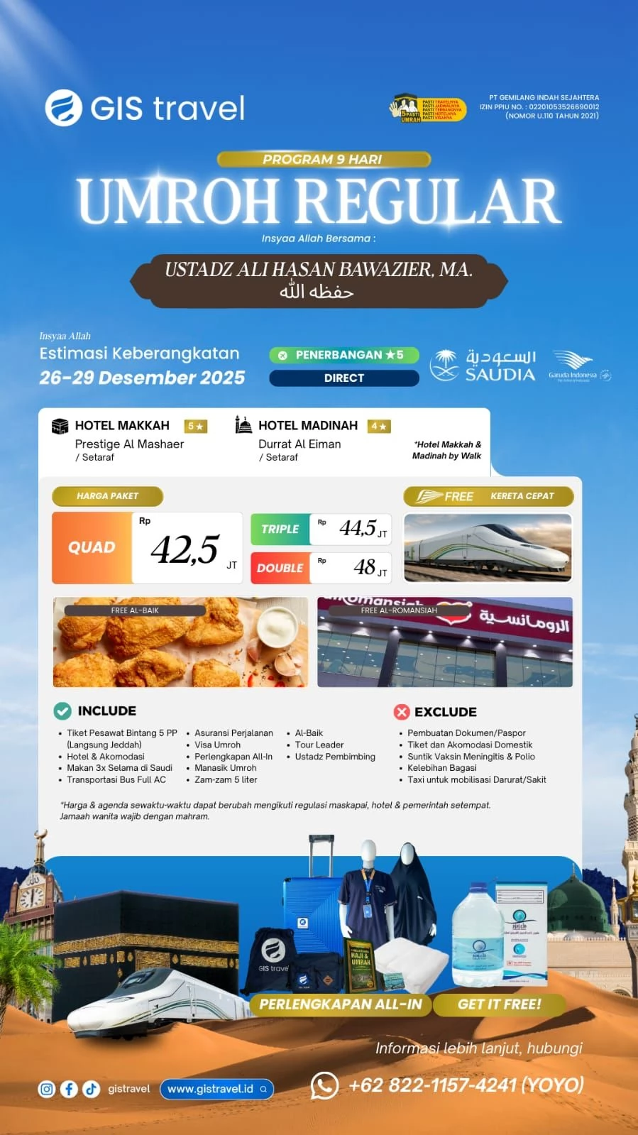 Bagi Anda yang ingin merasakan perjalanan Umroh dengan fasilitas terbaik, GIS Travel menawarkan program Umroh Regular pada 26-29 Desember 2025. Dalam perjalanan ini, Anda akan dibimbing oleh Ustadz Ali Hasan Bawazier, seorang pemimpin yang berpengalaman dalam memberikan pencerahan spiritual selama perjalanan ibadah. Berikut adalah rincian lengkap paket Umroh yang luar biasa ini: