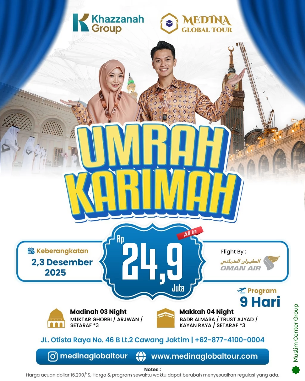 Bagi Anda yang merencanakan perjalanan ibadah umroh bersama keluarga pada akhir tahun 2025, Khazzanah Group melalui Medina Global Tour menawarkan program “Umrah Karimah” dengan pemberangkatan 2 dan 3 Desember 2025. Program ini dirancang untuk memberikan pengalaman umroh yang nyaman, lengkap, dan sesuai standar layanan terbaik.